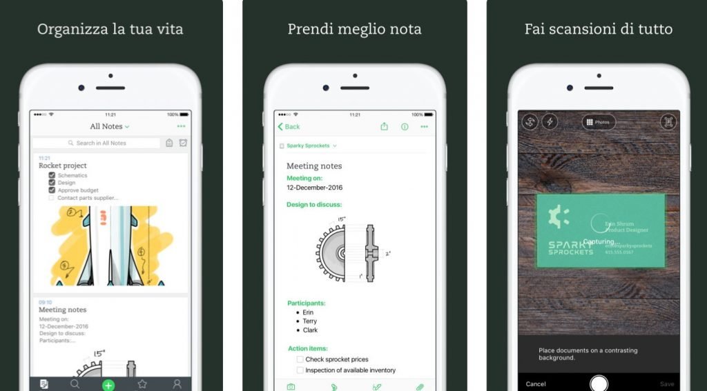 Più in generale, Evernote dà la possibilità di sincronizzare il contenuto su diversi dispositivi: sincronizzare automaticamente su computer, cellulare e tablet, iniziare il lavoro su un dispositivo e continuarlo su un altro, aggiungere un Blocco passcode all’app mobile per maggiore privacy. In seconda battuta mette a disposizione gli strumenti per condividere, discutere e collaborare produttivamente con gli altri ovvero creare, condividere e discutere con altri utenti e cercare in figure e annotare immagini per dare un rapido feedback. Utilizzabile anche per Apple Watch, gli utenti possono dettare le note da trascrivere in Evernote, visualizzare note, impostare promemoria e ricevere notifiche.